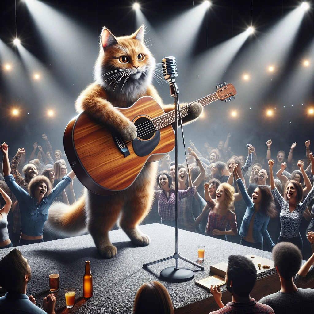 A realistic animated cat holding a guitar and singing on a stage. show the crowd jumping and enjoying the music. theme is party night with spot light effects.